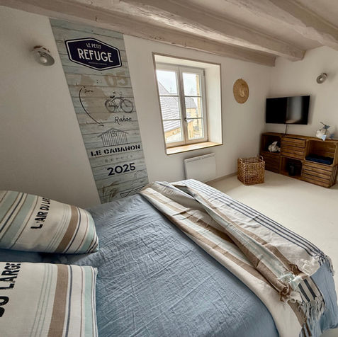 Rejoignez la suite L E CABANON située à l'étage du Petit Refuge. Elle vous séduira par son caractère avec ses jolies poutres apparentes et son ambiance bord de mer à la fois douce et apaisante.